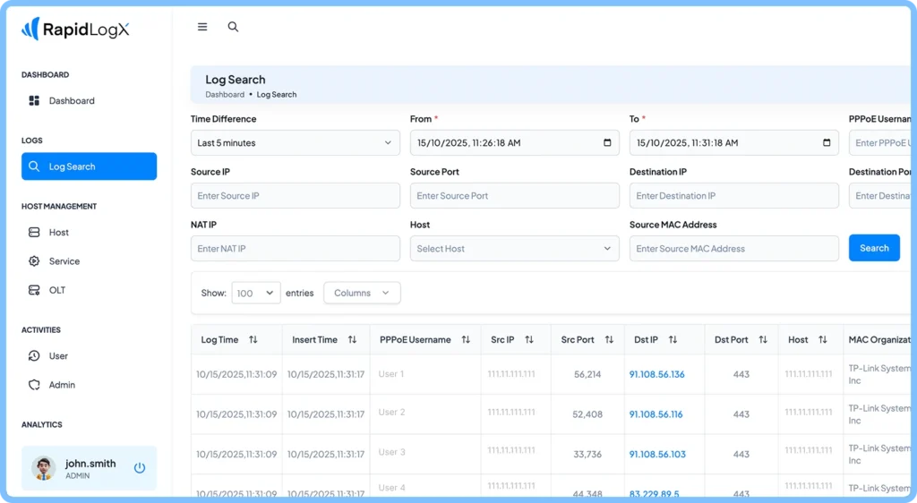 Access and search user logs across all connected hosts in real time. RapidLogX allows you to instantly locate any session by IP, MAC address, or username — giving ISPs full visibility into user activity and connection history. Easily filter, trace, and export logs to meet compliance and ensure fast, precise diagnostics across your network.