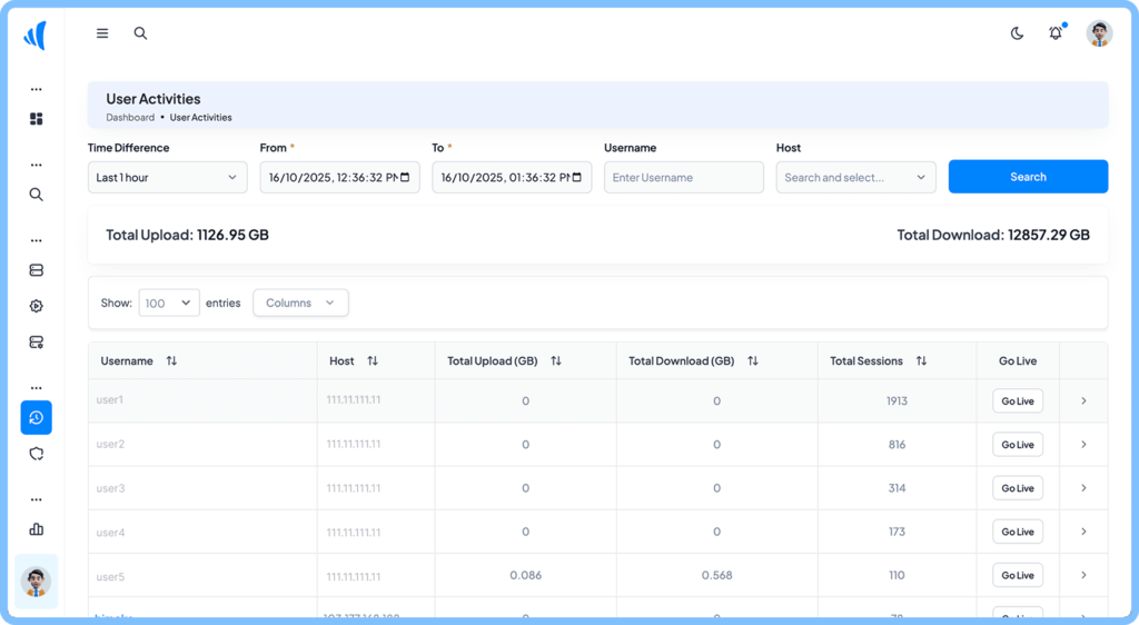Track every user and admin activity in real time with complete accuracy. RapidLogX provides detailed insights into login sessions, data consumption, upload/download speeds, and live bandwidth usage. Monitor performance, identify top consumers, and ensure transparent, BTRC-compliant reporting for every connected user.
