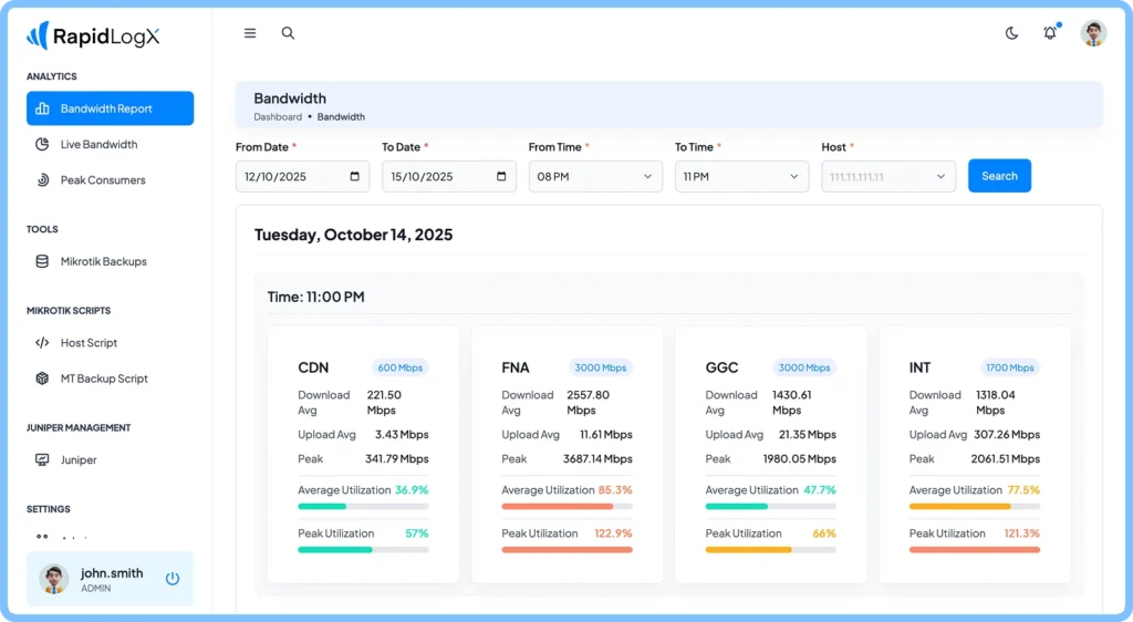 Easily connect and manage multiple network devices from a single interface. With RapidLogX, you can link Mikrotik, Cisco, Juniper, or Linux-based hosts and configure dedicated services like CDN, FNA, or GGC bandwidth allocations. Monitor device health, sync configurations, and maintain complete visibility over your network infrastructure — all in one centralized dashboard.